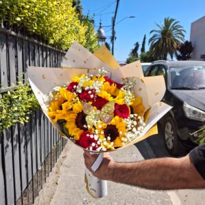 Un ramo compuesto por 5 rosas rojas ecuatorianas y 7 frescos girasoles, decorado con follaje verde. Las rosas rojas aportan pasión y elegancia, mientras que los girasoles añaden luminosidad y alegría. El follaje verde completa el ramo, brindando frescura y equilibrio, ideal para ocasiones especiales.