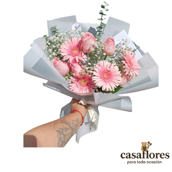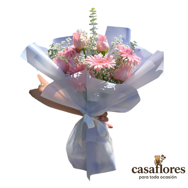 Un ramo delicado donde predomina la GERBERA en tonos pasteles como rosa pálido, melocotón y lavanda, con centros dorados y hojas verdes que realzan su suavidad. Atado con una cinta de seda o yute, el ramo refleja serenidad, sofisticación y ternura.